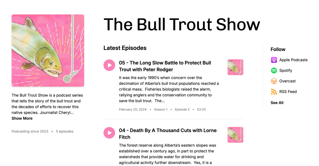 As part of the 2019-2023 New Frontiers in Research Fund project ‘Plural Perspectives on Bighorn Country’, Todd worked with veteran Alberta science and environment broadcaster Cheryl Croucher to co-produce an ongoing podcast series that tends to the inter-related challenges that bull trout, Salvelinus confluentus, face in Alberta today. This is part of their ongoing collaborative work with Dr. Janelle Baker, Mr. William Snow, Dr. Lorelei Hanson, and Erin Slater on ‘restorying bull trout’ in south-western Alberta.